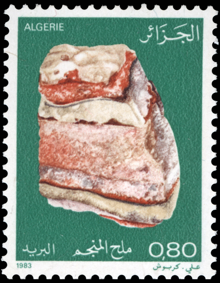 Halite, otherwise known as "rock salt" is one of four minerals depicted on a series of Algerian stamps issued on April 21, 1983. In 2020 Algeria produced 95 100 metric tonnes of salt, .03 percent of global production. About 2% of this comes from the Biskra salt mine, one of the largest open pit salt mines in Africa. Operated by CHLORAL, the first private Algerian mining group, it produces de-icing salt for export, industrial salt used in chemistry, oil drilling, water treatment, cosmetics, the pharmaceutical industry and agriculture, as well as food-grade salt for agri-food preparations, natural food preservation and kitchen salt.